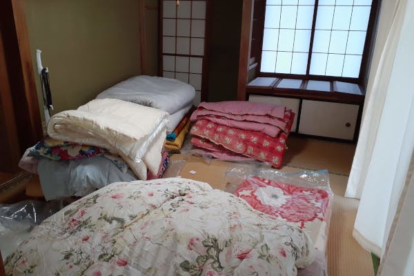 皆様からご寄付頂いた、布団置き場になっております。2月中にはテスト宿泊を予定しているので、それに向けて布団を整理したり、洗ったり、ほつれを直したりしています。