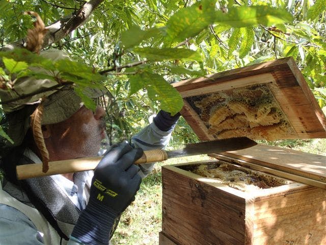 また、2009年に長野県の知人から日本ミツバチを譲り受けたことを機に、ちびっ子農園で飼育活動を続けています。巣箱から採れる蜂蜜はとびきりの甘さ。飼育は試行錯誤の連続で大変ですが、日本ミツバチとの触れ合いはかけがえのない経験です。