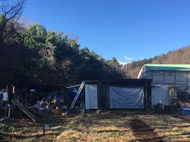 (農園の現在の小屋全景。写真左中央の扉がトイレですが、老朽化して水が流れなくなっています。また、屋根付きの休憩場所がない状態です)