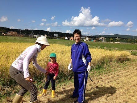 農家と学生をつなげる取り組みを能登で始めたのは、森本明日美さん。2010年、1年間休学していた際に参加したgreen drinks Kanazawaで奨学米プロジェクトについて知りました。すでに新潟と東京などでコメオヤさんと学生さんをつなげる「奨学米」のしくみがはじまっていたのです。2011年9月に『ソーシャルビジネス体験実習』という授業をきっかけに、若い人の少ない能登で、農業を担う中島アグリサービスの松田武さんと知り合いました。