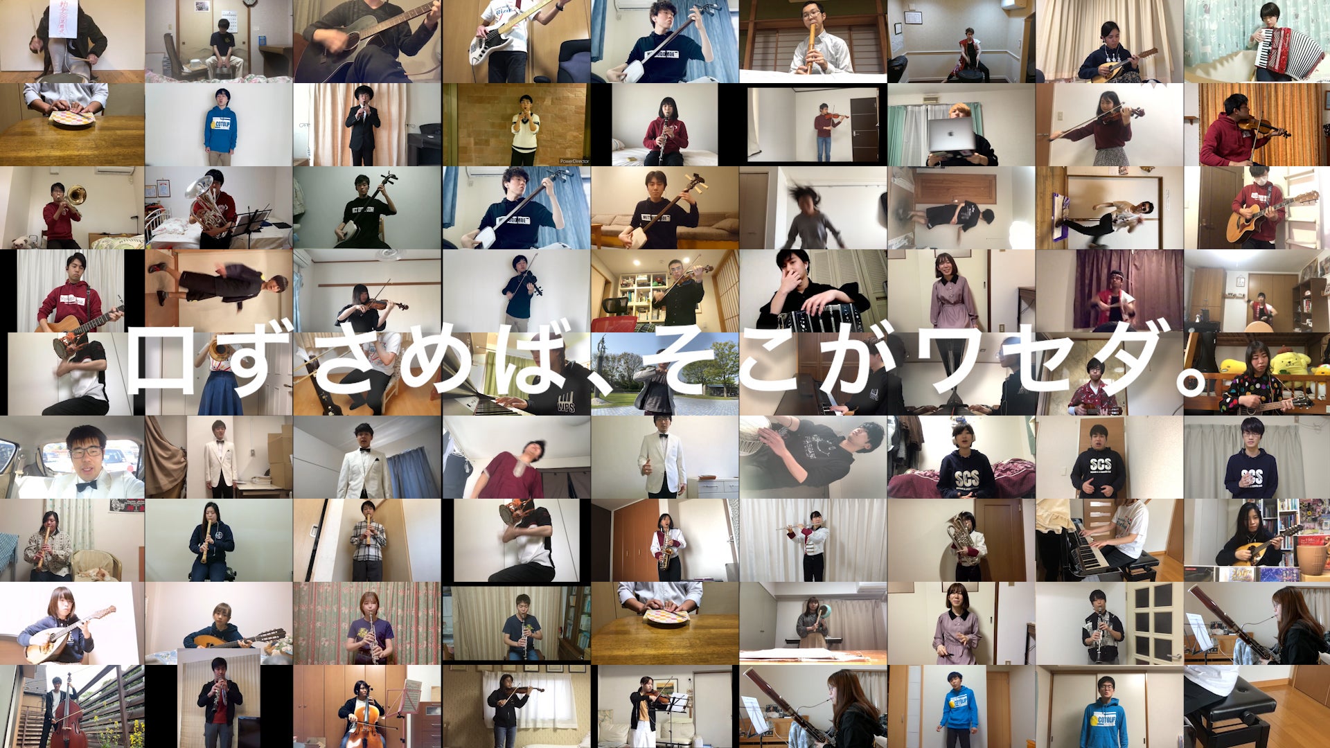 望んでいた学生生活が送れず悔しい日々が続く中、どうにか全国の早稲田生に少しでも早稲田を届けられたらと、「紺碧の空」を21団体総勢81名で合同演奏を行いました。この企画は、SNSにて反響をいただき地上波含め各種メディアに取材を受けました。