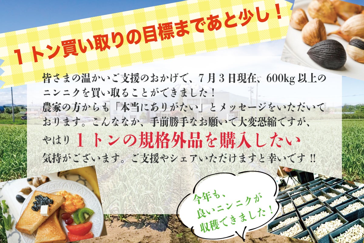 こんにちは、かぐや農園です。ついに、本プロジェクトも最終日を迎えました!!皆様の温かいご支援のおかげで、7月3日現在、600kgのにんにくを買い取ることが出来ました!!(例年に比べ、今年のにんにくはとても出来が良いです!!)にんにく農家の方々からも、改めて「本当にありがたい。」というお声をいただいております。本当にありがとうございます!!!ですが、我々としては、やはり当初の目標だった「1トンの規格外品を買い取りたい!」という気持ちがございます!!あと残りわずかで、目標達成できます!皆様どうか、ご支援やシェアにご協力いただけますと幸いです!!あと残り数時間、どうか、宜しくお願いいたします!!
