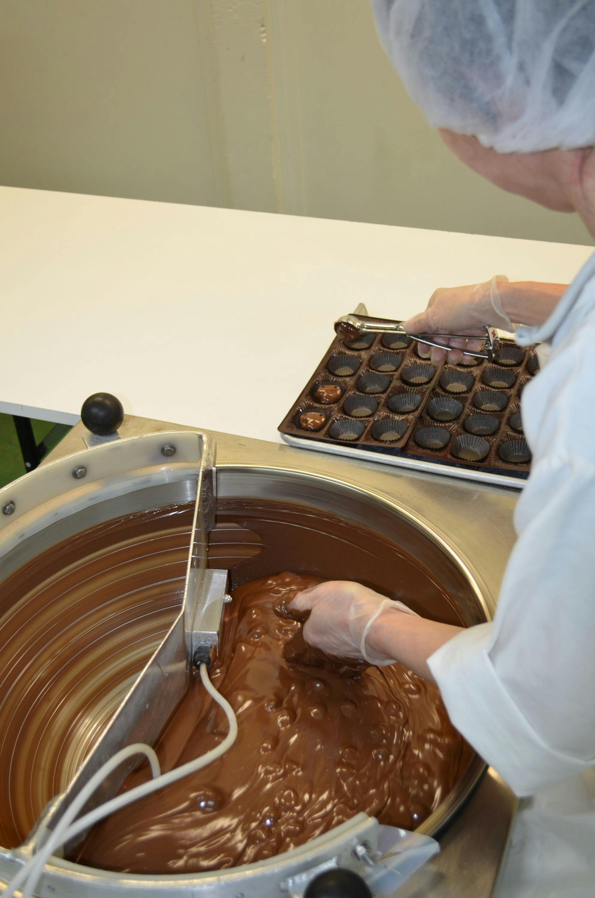余計な熱を加えず手作業でナッツをチョコレートに絡めているので、風味豊かなマカデミアナッツチョコレートが出来上がります。