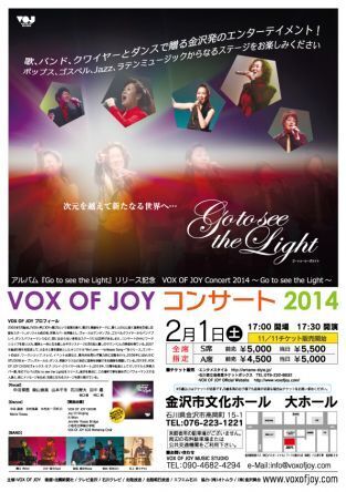 【完成したCD!】 出来上がった「Go to see the Light」CDをお送りします! 【オリジナルTシャツ!】 VOX OF JOYオリジナルTシャツ(サイズはS〜L)を贈呈します! 【コンサートチケット!】 2014年2月コンサートチケットをお送りします! ※コンサートは2014年2月1日に金沢市で行います。会場までの交通費等は含まれません。 【プライベートライブ!!!】 VOX OF JOYがあなたのためにだけに歌います! ※プライベートライブは、VOX OF JOY STUDIOで行います。STUDIOまでの交通費は含まれません。ライブ日程は、ご本人と調整いたします。