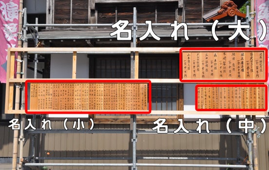 名入れの板の大きさには3種類あり、(大)と(中)は金額とともに、それぞれ一枚の板に名入れさせて頂きます。