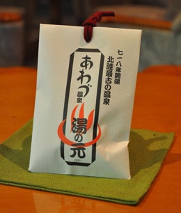 ▲粟津温泉の湯の素が入った小袋とボトルです。自宅で粟津温泉を感じて下さい!