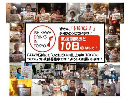 いよいよ10日を切りました! 本プロジェクトの支援募集期間が10日を切りました。一桁の数字をみるといよいよって感じがしますね。これまでにご支援頂いて39%まで集まっています。ここからが本番です!! 「石川芋づる会いいじ!プロジェクト」 FAAVOで本プロジェクトに興味を持たれている方はすでにご覧になってくださっているかもですが、今回情報発信としてIDiTのfacebookページに、今回の「石川芋づる会」の応援サポーターの方々のいいじ!画像をアップし続けています。 本当に皆さん良い表情をされていて、石川県民やそうでなくても仕事で石川に携わっている人など、多彩な方々が登場しており、ついに今日20組目アップしました! 残り10日も切ったということで上記の画像のようにいいじ!をひとまとめにしてみました!応援してくれている方が沢山いることを噛み締めて、上映会がちゃんとできるように頑張っていきたいと思います! facebookではそれぞれのいいじ!画像にはどんな方が応援してくれているかのコメントを付けてありますので、ぜひ、facebookページのほうもご覧ください! Ishikawa Drinks in Tokyo Facebook page 応援よろしくお願いします!! https://faavo.jp/ishikawa/project/85