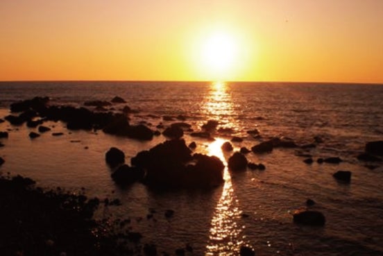 ▲仁江海岸からの夕日。塩の元となる海水を採る、揚げ浜塩田から見える夕日は不思議と特別な雰囲気があります。