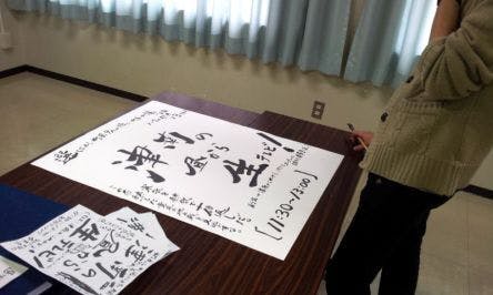 今日は看板に貼る題字書きを津南の若手書家・高橋氏に頼みました。