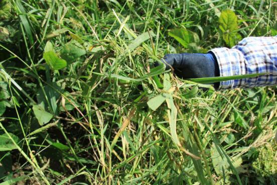 ただ、「宝の土地」である耕作放棄地は農地としては荒れてしまっているため、再生までには相当の時間と労力を必要とします。草がまだ枯れていない状態で土の中に入ってしまうと野菜やお米に障害が出てしまいます。自然界で草が青いまま土の中に入るということはありません。今までの草刈りでは刈った草が積み重なり枯れるのに時間がかかるため、刈った草を畑の外に出していました。