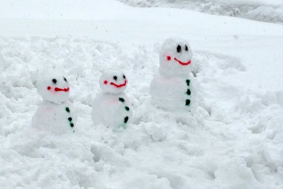 起:十日町市の冬。外では子どもたちが元気にソリ乗りや雪合戦をして楽しんでいる。そんな中、二人の兄弟が三体の雪だるまを作る。真ん中は大きなお父さん雪だるま、左右には小さな子ども雪だるま。兄弟は嬉しそうにまた、友達と雪遊びをし始めた。