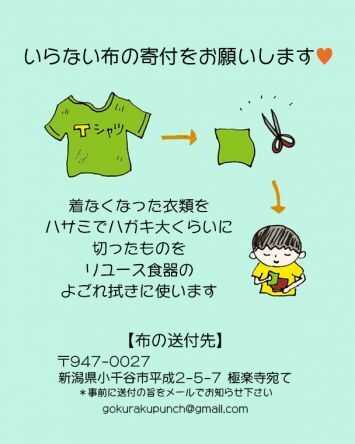 食べ終わった食器を返却する時は、お客様に着なくなった衣類をカットした布で汚れを拭き取ってもらってから、返却してもらっています。