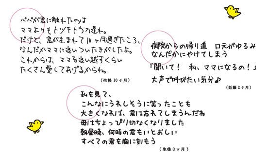 妊娠・出産から赤ちゃんが1歳の誕生日を迎えるまでの特別な期間のメッセージは、不安な心に寄り添い、イライラした心に安らぎをくれます。