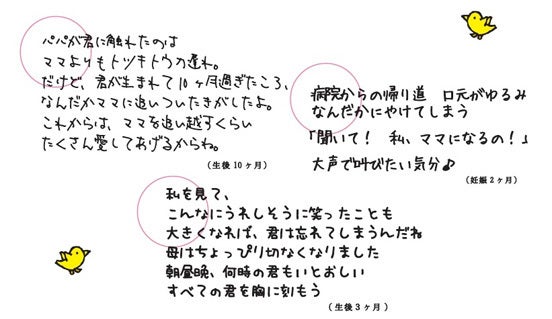 妊娠中から0歳児を育てるママ・パパから、赤ちゃんへ贈る愛のメッセージを集めるプロジェクト。2002年にavexのMàrm projectからスタートして以来、書籍や自治体とのコラボなどで作品集を発行しています。子育て中の心の支えとして読者を増やす一方、学校のいのちの授業などでも活用され、幅広い層に広がっています。