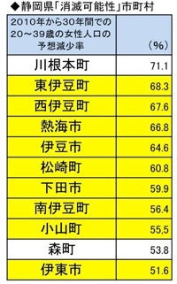 ▲黄色い市町が静岡県東部・伊豆エリアです。出典)日本創成会議・人口減少問題検討分科会の推計