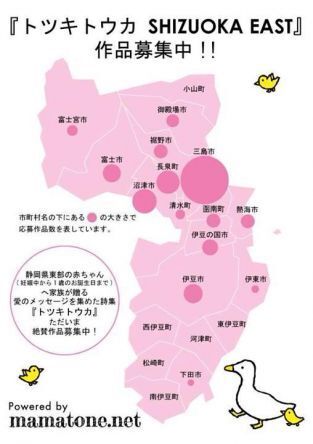 FAAVOをご覧のみなさま、はじめまして。静岡県東部の子育て情報サイトの企画運営をしている「ママとね」の野田・中島です。この度、トツキトウカプロジェクト(妊娠中から0歳児を育てるママ・パパから、赤ちゃんへ贈る愛のメッセージを集めるプロジェクト)とのコラボで、静岡県東部版『トツキトウカSHIZUOKA EAST』を発行します!地元のママたち30人ほどで実行委員を組織し企画する、全国初のママ発『トツキトウカ』。詩集は2014年10月発行、エリア内各所での無料配布を目指しています!