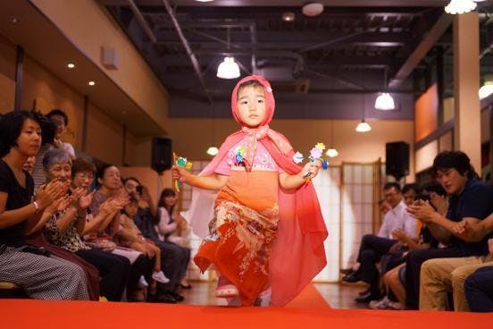 <ファッションショーの一幕:風呂敷ファッションの女の子>
