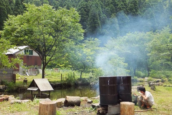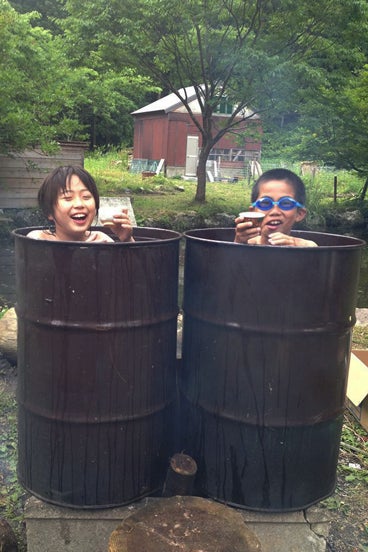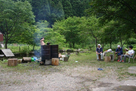 百笑の郷ではこんなことをしています。 ・ドラム缶風呂 ・川遊び ・洞窟探検 ・そば打ち、流しそうめん ・薪割り ・竹細工、木工細工 ・農業体験 ・滝行 ・ヨガ などなど 会員になるとこれらの体験が半額になります。(そば打ちと流しそうめんはのぞく) 開放感いっぱいのドラム缶風呂!