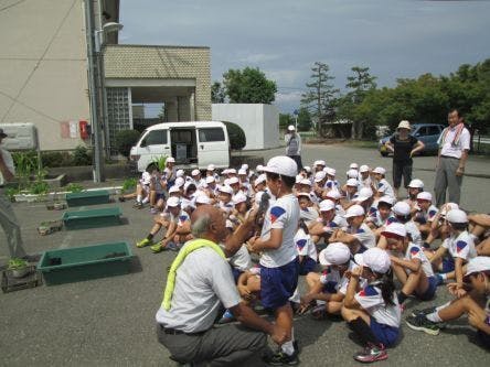 水やりのレクチャーです、植物を育てる事の大変さも学びます。