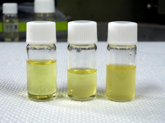 完成した能登ヒバオイルをサンプルボトルに詰めて。