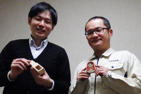 ▲起案者・市井(左)と木箱を作成して頂いた北村木箱株式会社の北村専務(右)。手に持っているのはキリひめちゃん。