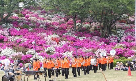 鯖江市の春の一大イベント「さばえつつじまつり」。今年は5月3日から5日に開催され、大勢の観光客で西山公園が埋め尽くされました。 そのつつじまつりの初日、5月3日に吹奏楽の演奏が行われました。 晴天の西山公園の芝生広場で、咲き誇る色とりどりのつつじに負けず、鯖江中学校の皆さんは「吹奏楽魂」と書かれたオレンジ色のTシャツを着て統一感バッチリでした。 まずは芝生広場の周りを大行進して始まった演奏会。 全体演奏だけではなく、楽器ごとに紹介をしながら演奏をしてくれました。 青空の下に響く吹奏楽の音色はとてもさわやかで、子どもたちの生き生きとした様子もとてもほほえましかったです。
