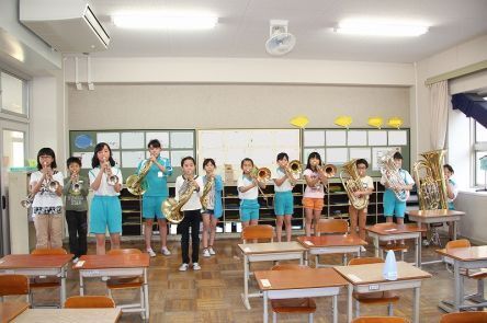 引き続き、神明小学校の子どもたちの様子をお伝えします。 一つの教室に、金管楽器を担当する子どもたちが大集合してくれました。 向かって右側の大きな楽器はチューバ。低音を担当しています。 その左側で抱えて演奏しているのはユーフォニアム。メロディーやハーモニーを担当しています。 真ん中の楽器はトロンボーン。長いスライドを動かすことで音程をつくっています。 左から2番目の楽器はホルンです。かたつむりのような形で、丸みのある音が出ます。 一番左の楽器はトランペット。金管楽器の中では高い音が出ます。曲の中ではメロディーを担当することが多いです。 さて、この金管楽器の皆さんでミニ合奏をしてもらいました。パート練習もそれぞれの楽器の音をじっくり聞くことができて楽しかったのですが、やはり合奏となると迫力が増しますね。真正面にいたからかもしれませんが、一体感と臨場感があり、感動しました! 感動できる音楽を奏でることができるというのは、本当にすばらしいことです。これからもさらに高みを目指して頑張ってほしいです。