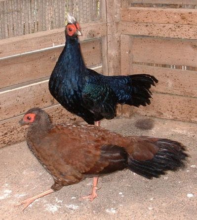 *コサンケイの大きさは58~65cmで、雄は全体は青黒色で、短い毛羽立った白色の冠を呈し、顔が赤色です。雌は羽の中央部が茶色、尾羽は黒色、暖色系の色に杯茶色混じった翼です。