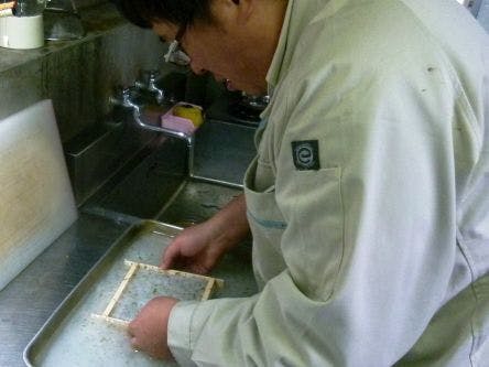 作り方は、僕たちの主食は「竹の葉」なんだけど、うんちの中に残った竹の繊維を熱湯で殺菌し、牛乳パックを溶かしたものと一緒に調合します。これにのりを混ぜて、紙を漉く要領でしおりの形にして、乾燥させます。