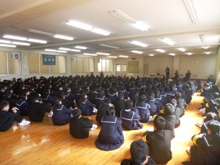 たくさんの生徒が自転車通学でした。自転車で通学する時の注意は色々ありますが、特に思いやりをもって運転することを話しました。また歩いて通学する時は、他の歩行者の迷惑にならないよう何人も横に並んで歩かないでと呼びかけました。