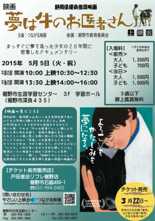 ★3000円以上ご支援のリターン品「やさしい上映会」観覧ご招待メールのご利用方法について★ ご招待させていただく上映会は、 5/5(火・祝) 開催『第3回やさしい上映会「夢は牛のお医者さん」』です。 午前の部、午後の部のうちご希望の回で1回のみご利用いただけます。 上映会当日、お送りしたメールをプリントアウトしてご持参いただくか、 送信メールの画面を会場受付窓口でご提示ください。 また、『須山うどん』『御殿場 時の栖「やさい食堂 楽風」利用券1000円』や『時の栖グループ温泉ご招待券1500円』は、ご来場時にお渡しします。 観覧ご招待メールは、3000円以上を支援してくださった方に プロジェクト成立後の5/2~5/4の間に、 「つながる映画」tunagaru.movie.susono@gmail.comからメールをお送りいたします。 迷惑メールの受信制限の設定をされている場合は、 受信できるように指定設定をお願いいたします。 なお恐縮ですが、メールの着信状況にお気を付け下さい。 その他のリターン品 ご都合により5/5(火・祝)の上映会にご来場いただけなかった方には、 『須山うどん』『御殿場 時の栖「やさい食堂 楽風」利用券1000円』 『時の栖グループ温泉ご招待券1500円』などは、後日郵送いたします。 また、観覧ご招待メールに代わるリターン品については 後日、「つながる映画」tunagaru.movie.susono@gmail.comより、 ご案内をお送りいたします。
