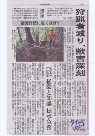狩猟者減り、獣害深刻  経験と知識 伝承急務! 猟師は「森の番人」 里山を守る後継者を育てないと里山集落が維持できなくなる。