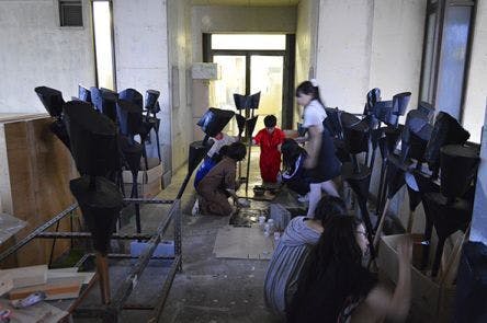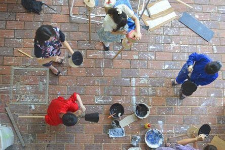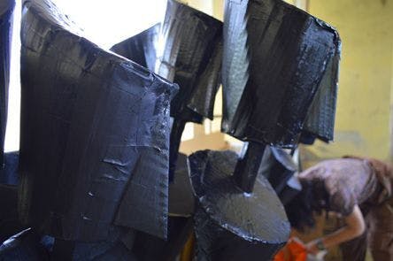 続いてこちらは芸祭本部とパレードセクトも一緒になってなにやら黒いものを作っている模様。