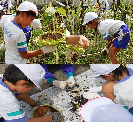 震災の起きた日のことは忘れられません。 大変な現実を前にして何もできない自分が無力だと思い知らされました。 そんな中で、自分にできるとこはないか考えました。 そして、「小学校教師として今の自分にできることは、このような災害が起きた時に助け合う気持ちをもった子どもたちを育てることだ」と気づきました。 時を同じくして、石川の友人がひまわりを育てて種を福島に送る活動をしていると教えてくれました。 これだったら子どもたちと一緒にできると思い、同じ学年の先生に相談して賛成をもらいました。 そして子どもたちに提案をしたところ、全員が「やりたいです!!」と賛成してくれたのです。 種をたくさん(25000粒位)買い込み、子どもたちのお手紙とひまわりの育て方を書いた用紙に10粒ずつ種を包み、それに一人一人が手描きのメッセージを書きました。 休み時間も返上して子どもたちは一生懸命にメッセージを書き続けました。 全部で2500個作りました。 その包みを持って子どもたちが他の学年の子や近所に配って歩きました。 私も講演会で紹介しました。新聞にも紹介していただいて、大勢の協力者が現れて、種は県内外に広がっていきました。 自分たちも畑をお借りしてひまわりの種を播きました。水やり、草取りなどの世話をして秋にはたくさんの種ができるとともに、学校にものすごい数の種が届きました。 これが一年目の様子です。 ・・・・・このひまわりの活動を4年間ずっと続けてきました。 この種を送ったところが福島ひまわり里親プロジェクトでした。