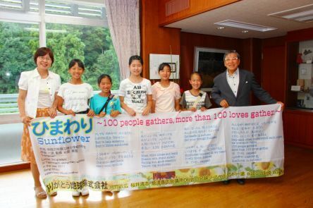 ひまわりの活動をすると決めた時に、子ども達に「他にしたいことは?」と尋ねたところ、ある男の子が 「歌を作って歌いたいです!」 と言いました。 その時に、「よし、歌を作ろう!」と思いました。 しかし、「福島ひまわり里親プロジェクト」を始める前では“いい歌”はできないと思い、活動を通して自分たちが汗水流した後に作ることにしました。 その年の12月、当時4年生だった85人の子どもたちが、震災に対する思い、福島に対する思い、被災地に対する思い、ひまわりに寄せる思い、日本への思いを自由に詩に書きました。 その85編の詩を元に、私が一曲の歌詞にまとめました。 その歌詞に、地元で活躍するバンド「一途」(いちず)のくまひげさんが曲をつけてくださり、復興支援ソング「ひまわり」が誕生したのです!!