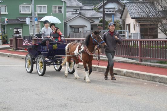 現在、珠洲市の商店街に馬車を運行させています。使用する馬車は6人乗りの小型なもので、馬と一緒に走っている自然な揺れを味わうことができます。お客様のご要望に臨機応変に対応することができるこの馬車で、街で買い物や観光を楽しんでもらいたいと思っています。