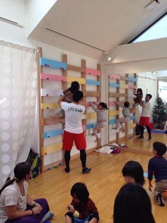 壁に設置された板を登ります。安定した板なので、みんな比較的簡単に登っていました。できる子には、登り方に条件を加えました。これが、意外と難しい!!