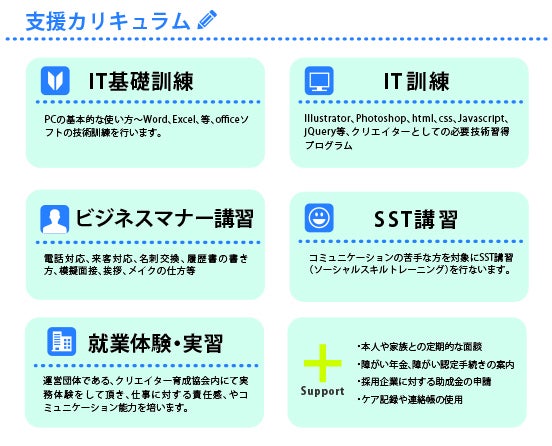 障がいの有る無しに関わらず高い自立意識を持った方の長期的キャリア雇用をサポートする本プログラム。この事業の要は、スキル習得後のサポート体制です。具体的には、専用ソフトの操作方法を習得後、実際の制作案件に携わって頂きながらデザインやプログラミングなどの座学授業では得られない実践的なスキルを身につける事が出来ます。この事業の支援員はプロのデザイナーですので、クリエイター業界への就職が可能になる活きた技術を身近に触れることが出来、社会で自立した生活のワークライフビジョンも明確に描くことが出来ます。