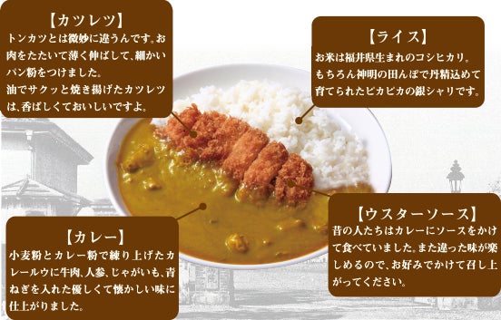 そして、もう一つ重要なポイントは「カツレツ」です。 「天皇の料理番」秋山徳蔵を魅了した、さっくりと揚がったアツアツで香ばしいかおりの漂う「カツレツ」。 これも、当時のレシピを参考に復元。 牛肉ヲ薄ク大切ニシ庖丁ノ脊ニテ能ク叩キ・・・とあるように、当時の通り、牛肉(または豚肉)をたたいて薄く延ばしさくっと焼き揚げて出来上がり。 そのカレエ(敢えて“カレエ”と書きます)に、揚げたてアツアツの「カツレツ」をのせ、ボリュームたっぷりに仕上げて「さばえ聯隊カレエ」の完成!!です。