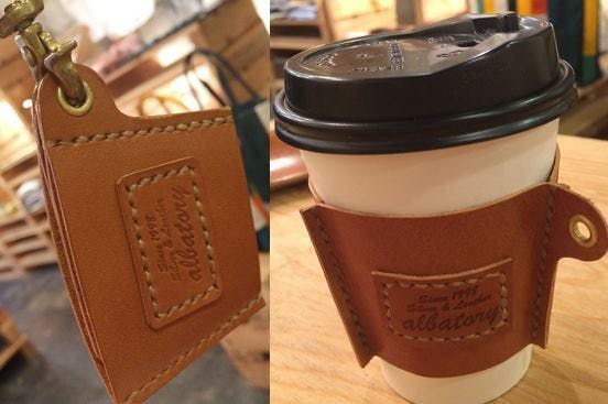 TuKuRu提携クリエーター、albatory(アルバトリー)さんのつくるオリジナルレザーカップホルダーを進呈いたします。本体は人気の栃木レザーを手縫い、金具は真鍮、使わない時はたたんでキーホルダーとして持ち運べます。
