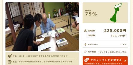 リターン品のひとつとして挙げさせていただいた「珠洲市青年団協議会の公式HPへのお名前掲載」について対応させていただきました。 珠洲市内だけではなく、市外、県外といった全国各地から出資していただきました。改めて、ありがとうございました。 http://www.ishikawa‐seinen.com/~suzu/love&peace/peace2015/peace02.htl