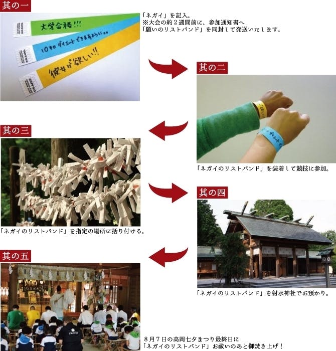 走り終えた後、皆さんの「願いのリストバンド」を射水神社本殿前の奉納所に、「おみくじ」のように括り付けてもらい、それを「射水神社」でお預かりします。 8月7日の「高岡七夕まつり」最終日に、願い短冊や、願道鑑札と一緒にお祓いし、お焚き上げを行い、一つ一つの願いをしっかりと天まで届けます。
