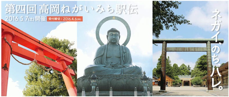 この街の中心部に、”願いの叶う道”とされる、3つのパワースポットを結んだ「ねがいみち(願道)」があります。その「ねがいみち」を駆け抜け、参加者の健康と共に「願い」を叶えるための駅伝を、平成28年5月7日(土)に企画しています。約2,000人のランナーと、応援、観戦の皆様で盛り上がってきたこの駅伝は、今年で4回目を数えます。