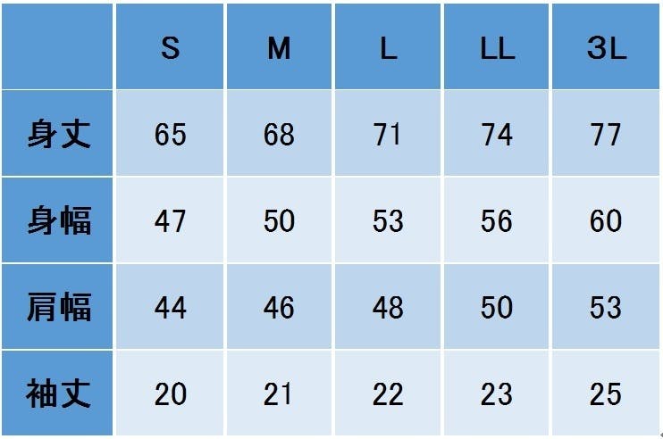 *サイズは以下のサイズ表をご確認頂き、ご支援の際に備考欄に「S」「M」「L」「LL」「3L」の5種類のいずれかご希望のサイズをご記入ください。