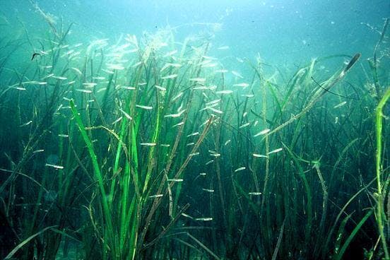 アマモ場では、アマモによって波がおさえられて、水の流れが穏やかになります。また、隠れる場所がたくさんあることから、魚や貝、エビやカニなどが卵を産み子供を育てるのにちょうどよい場所になります。それが