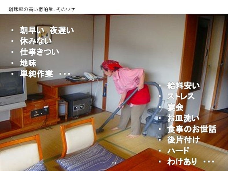 宿の仕事は、朝早く夜遅く、掃除や洗濯で一日が終わり、本当に地味で同じ作業の繰り返しです。離職率も48%と非常に高いです。