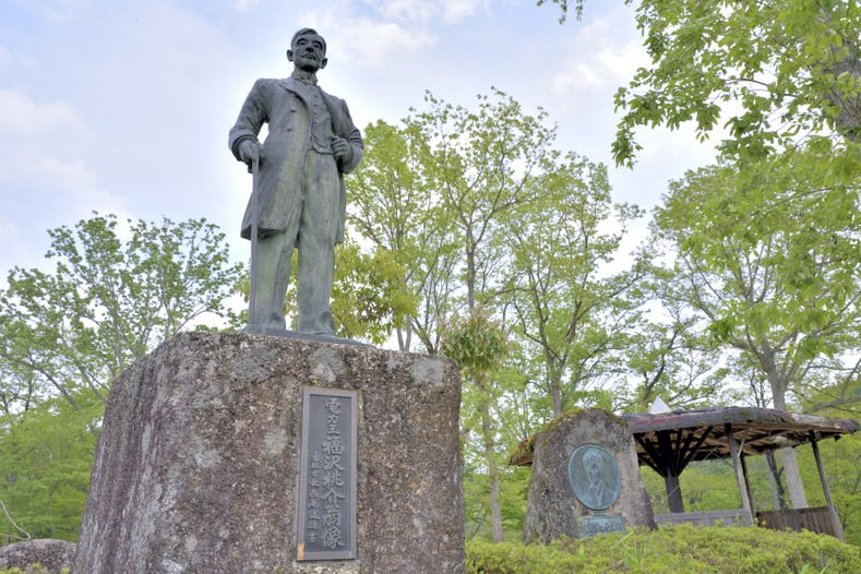 この恵那峡にあるさざなみ公園の小高い丘に、大井ダムを眺めるように立っているのが福澤桃介像と川上貞奴のレリーフです。時代を切り拓いた桃介の偉業と、それを支えた貞奴の功績を讃えています。なお、二人の物語は1985年にNHKの大河ドラマ「春の波濤」でも描かれています。