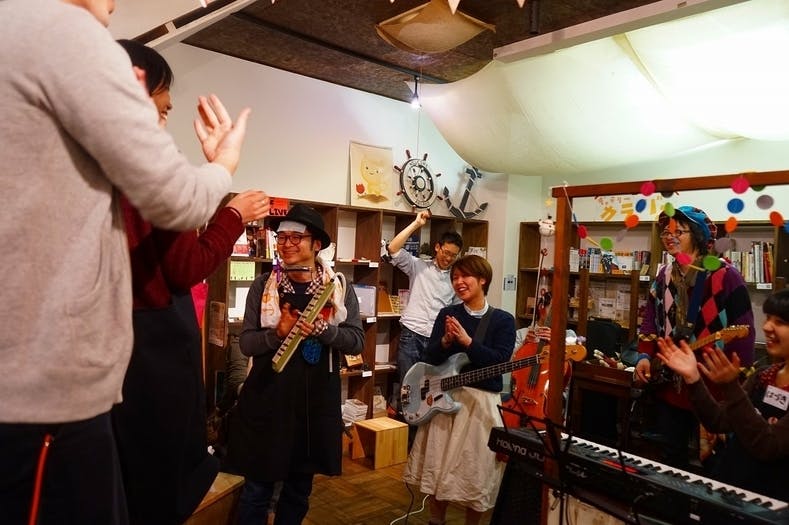 (ツルハシブックスで音楽イベントを行う若者たち)