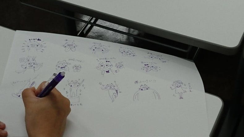 さすが、デザインを専攻されている学生さんたちだけあって、ウルウルちゃんメガメガくんのイラストも表情豊かで楽しいものがどんどん出てきます。