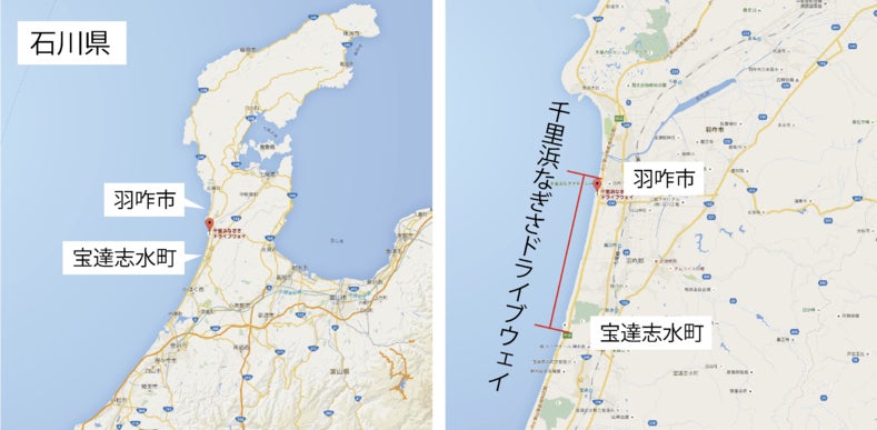 千里浜なぎさドライブウェイは、石川県宝達志水町から羽咋市にまたがった全長8kmのドライブスポットです。白山麓から流れ出るきめ細かい砂が堆積しているため、日本で唯一、世界的にみてもとても珍しい、波打ち際の海岸線を車で走行できる砂浜です。